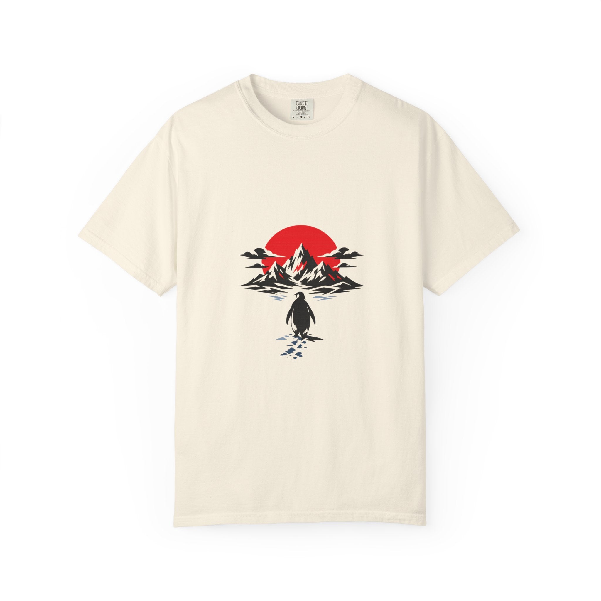 Minimal lone penguin walking toward mountains. Meme mood, clean silhouette.